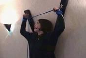 Even when she hangs at the cross with two socks in her mouth she desperately resists to tell anything. Only when the burglar tortures her toes with clothes pegs Nadine gives up to resist. She gives away the hiding place in her car. Soon the burglar returns. He is very angry because the floppies are provided with a password. It goes without saying that he wants to pump her for the password, otherwise the floppies are worthless to him.