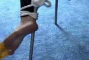 (The camera shows Jane on the bed, hands in handcuffs.) Some smelling salts wake her up. Of course Jane asks where she is and what the man is going to do. The stranger, sitting next to her on the bed, only laughs. "I"ll teach you a lesson you won"t forget for a long time!” He opens the handcuffs and leads her to a strange room. Here Jane is tied up in X-form between two roof joists. Now he tickles her. Especially on her tummy, soles and armpits.